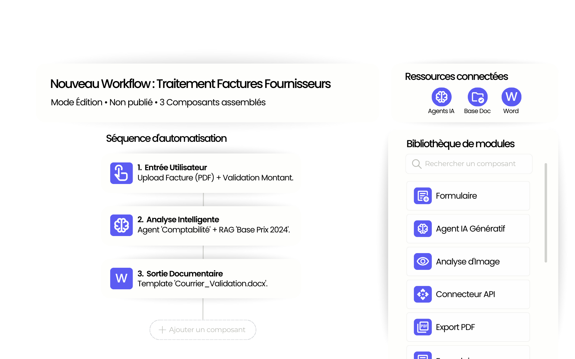 Un workflow uControlAi se compose d'étapes que vous assemblez selon vos besoins. Interactions utilisateur : upload de documents, sélection dans une liste, validation de choix, saisie de texte. Traitement IA : appel à un agent IA pour générer ou analyser, interrogation de vos bases documentaires (RAG) pour extraire des informations, analyse d'images ou transcription audio. Export : génération automatique d'un document Word personnalisé, prêt à être utilisé. Vous créez ainsi des chaînes d'automatisation fluides, hyper personnalisées et rapides à déployer.