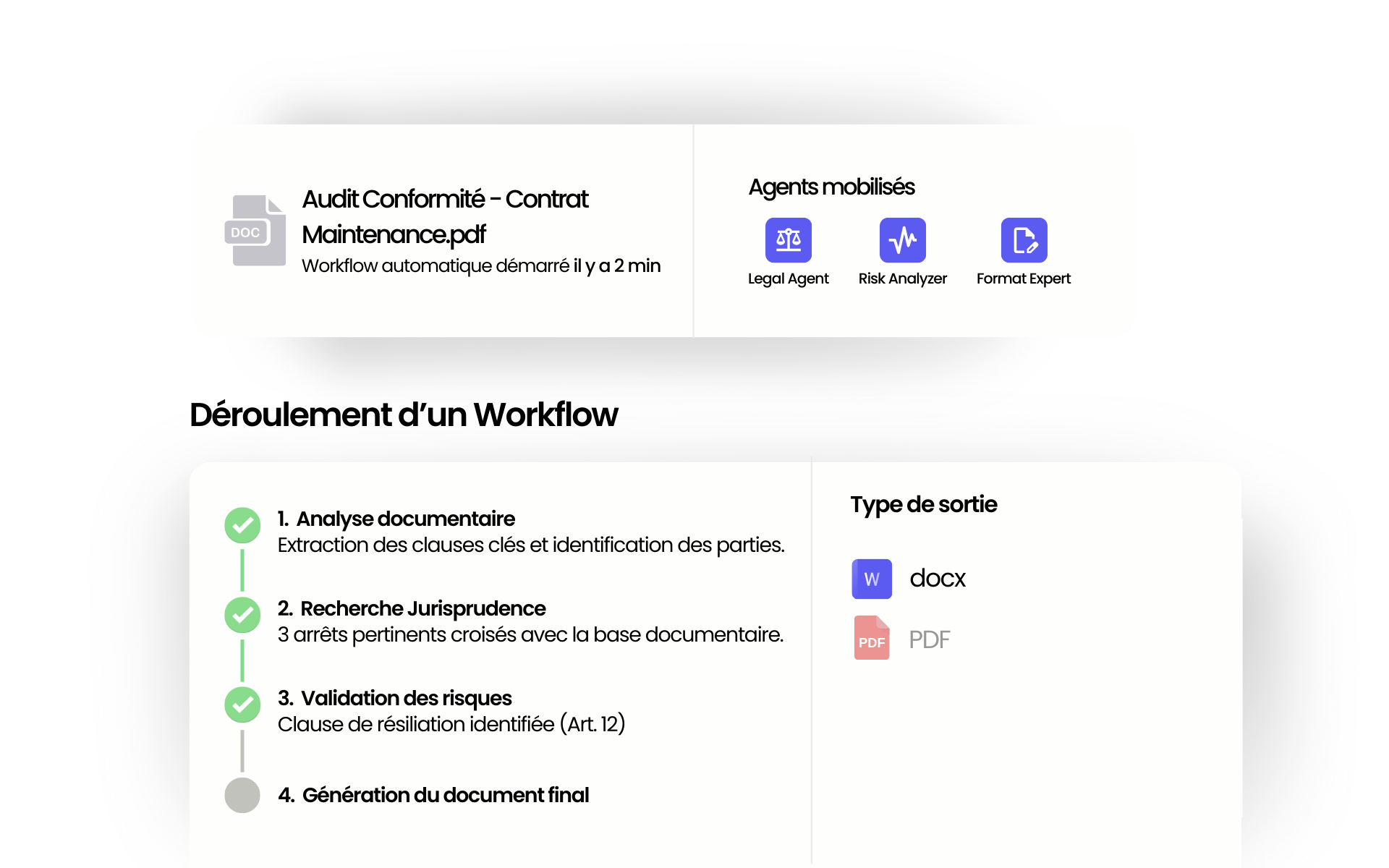 Un workflow IA juridique est un processus directif qui orchestre automatiquement une série d'étapes pour accomplir une tâche juridique complexe. Il combine interactions utilisateur (upload de documents, validation, sélection), appels à des agents IA, interrogation de bases documentaires (RAG) et génération automatique de documents. L'utilisateur suit un parcours guidé, sans avoir besoin de prompter : le workflow fait le travail.