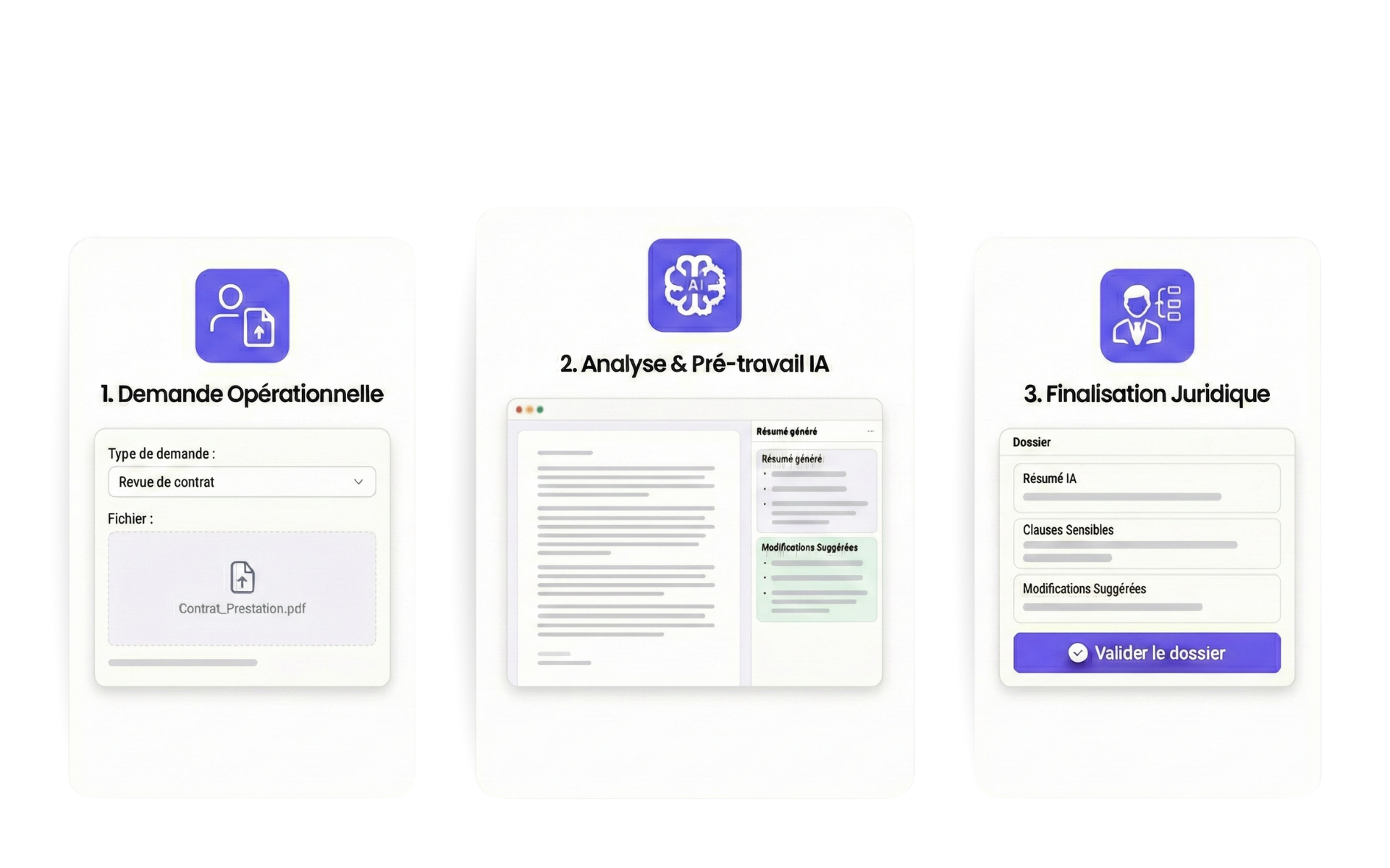 Créez un workflow qui guide vos collaborateurs opérationnels dans leurs demandes juridiques. L'utilisateur sélectionne son besoin (revue de contrat, rédaction, question contentieuse), upload le document concerné, répond à quelques questions de qualification. L'IA extrait et résume automatiquement les parties clés du document, que l'opérationnel devra valider pour responsabiliser sa demande. Le workflow mobilise ensuite un agent IA qui pré-travaille le dossier : analyse du contrat, extraction des clauses sensibles, proposition de modifications. Le projet est automatiquement envoyé au juriste, qui reçoit un dossier structuré et prêt à être finalisé. Résultat : gain de temps important, meilleure responsabilisation des demandes, juristes concentrés sur la valeur ajoutée.